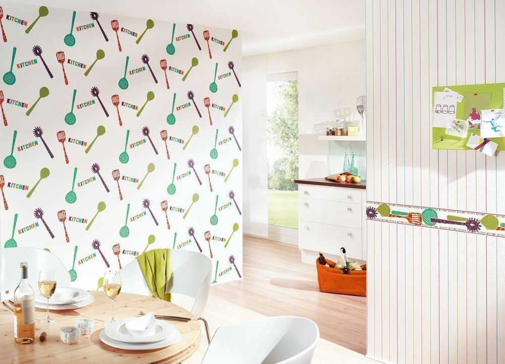 На кухне обои должны сочетаться с отделкой, которая используется на рабочей стенке. Очень удачно смотрится симметричное зонирование, когда стены кухни оклеивают широкими полосами и дополняют ярким принтом на самой заметной открытой стене.