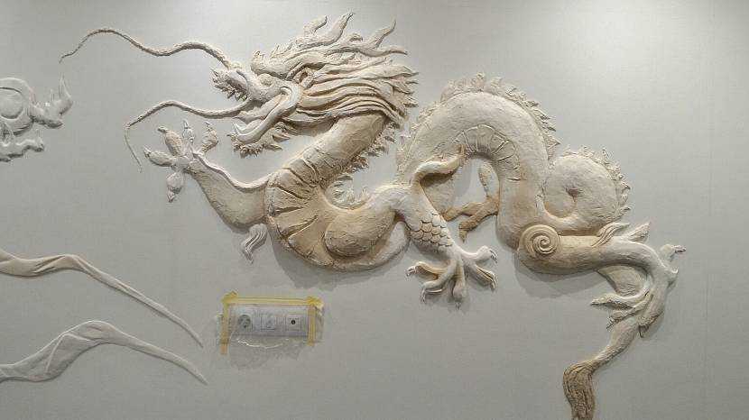 Работа над барельефом «китайский дракон» ещё не завершена. Заключительным этапом станет повторное окрашивание в соответствующий интерьеру оттенок. Только после этого изображение примет законченный вид.