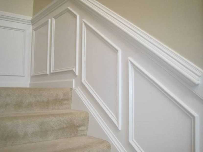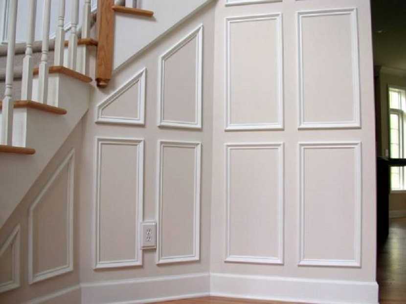 Сочетание прямого молдинга и лестницы на второй этаж. Аналогичным способом облицовывается нижняя часть – основание и дверь в кладовое помещение, подвал.