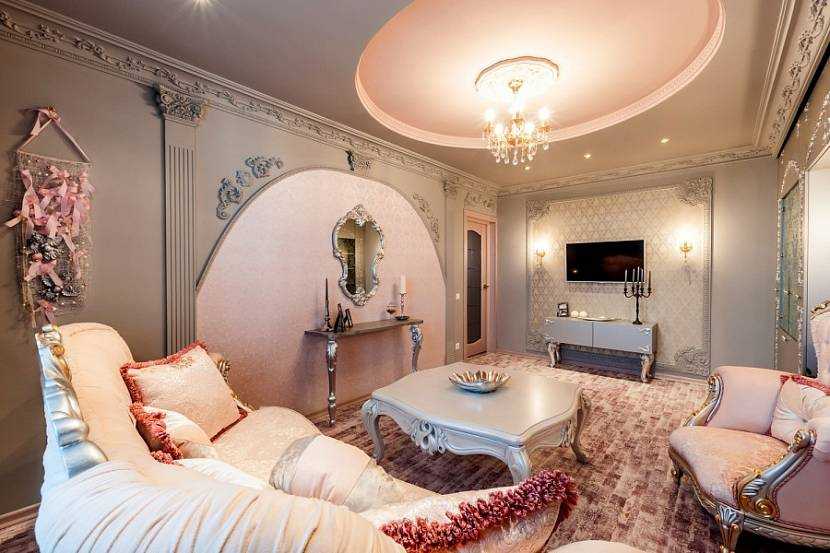 При оформлении жилого помещения, как правило, больше всего внимания уделяется именно гостиной, так как именно здесь хозяева демонстрируют свой стиль жизни, поэтому декор играет немаловажную роль. В просторных залах чаще всего можно встретить лепнину – она подчеркивает роскошь и потрясающую эстетику помещения. Ее можно использовать для потолков и стен, в качестве обрамления камина и даже современной техники. Изящными молдингами пространство «разбивают» на зоны, а колонны и капители вполне заменят отсутствие межкомнатных дверей между гостиной и кухней. Ключевым моментом может стать роскошная розетка для люстры.