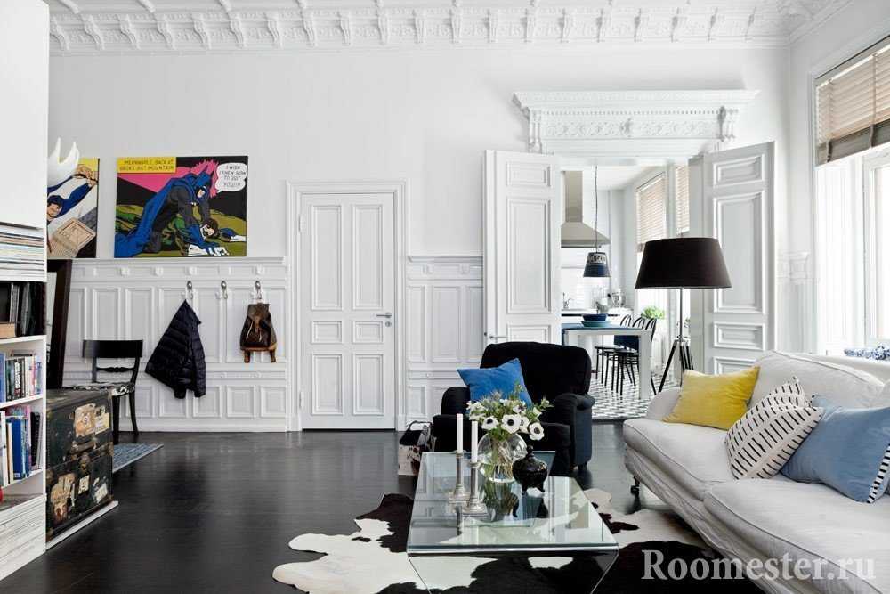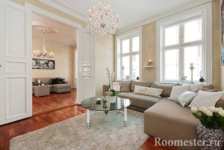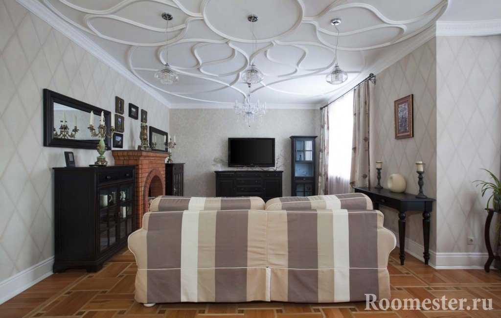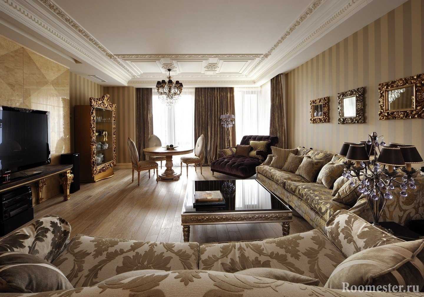 При оформлении жилого помещения, как правило, больше всего внимания уделяется именно гостиной, так как именно здесь хозяева демонстрируют свой стиль жизни, поэтому декор играет немаловажную роль. В просторных залах чаще всего можно встретить лепнину – она подчеркивает роскошь и потрясающую эстетику помещения. Ее можно использовать для потолков и стен, в качестве обрамления камина и даже современной техники. Изящными молдингами пространство «разбивают» на зоны, а колонны и капители вполне заменят отсутствие межкомнатных дверей между гостиной и кухней. Ключевым моментом может стать роскошная розетка для люстры.