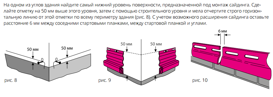 Начинать следует со стартовой планки. Она крепится на высоте 30–40 см от самой нижней точки объекта по отношению к горизонту. От того, насколько ровной будет стартовая планка, зависит расположение остальных элементов. В связи с этим лучше потратить больше времени на тщательное выравнивание этого элемента, чем в дальнейшем пытаться исправить перекос стеновых панелей.