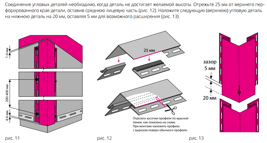 В случае если высота стен превышает 3 м, нужно будет стыковать 2 профиля. Это простая, но требующая внимания операция. Возьмите ножницы и отрежьте гвоздевую полосу на верхнем угловом изделии. Оставьте только 2 полосы, которые складываются в угол. Смонтируйте нижний профиль. Верхний устанавливается поверх нижнего. Получившаяся стыковка будет обеспечивать защиту двух изделий от дождя и снега. Нахлест углов не должен превышать 2,5 см. Ширина зазора между отдельными планками должна быть менее 9 мм.