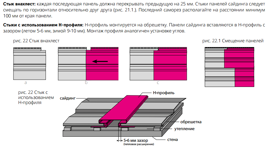 После того как смонтированы все сложные элементы, приступают к установке стеновых панелей на ровных участках фасада. Шаг монтажа составляет 20–30 см. В отличие от винилового сайдинга стыковка металлосайдинга не предполагает сохранения зазоров, поскольку он имеет незначительный коэффициент расширения. Стыковочный шов оставляется иногда лишь для того, чтобы не повредить лицевой слой материала при укладке, а также в случае ведения монтажных работ при нулевой или отрицательной температуре.