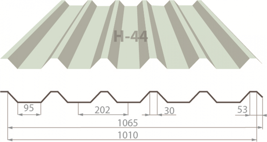 <<H>> – Эта буква показывает, что профилированный лист относится к несущему типу. Данный вид листа обладает высокими волнами и бороздами дающие дополнительную жесткость, которые расположены в нижней части волны.