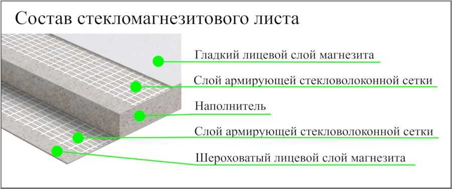- Состав — вспученный перлит, магнезит, хлорид магния, древесные опилки и стеклоткань, в качестве армировки. Также могут применяться синтетические волокна, как дополнительное связующее.