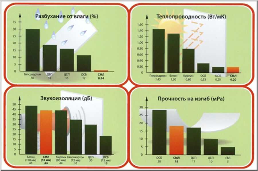 Даже самому водостойкому гипсокартону и уж тем более древесным плитам не сравниться в этом с СМЛ. Антисептичность компонентов минимизирует риски возникновения грибковых культур.