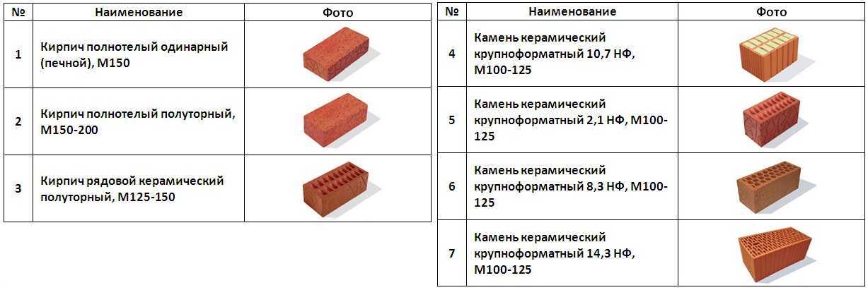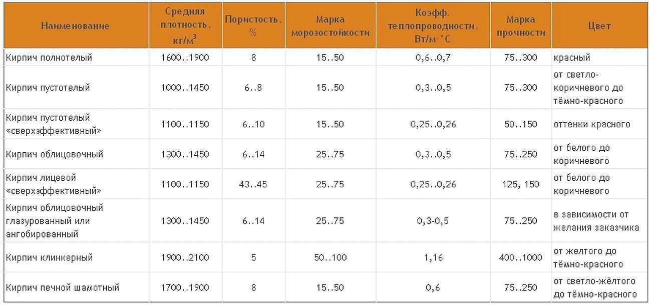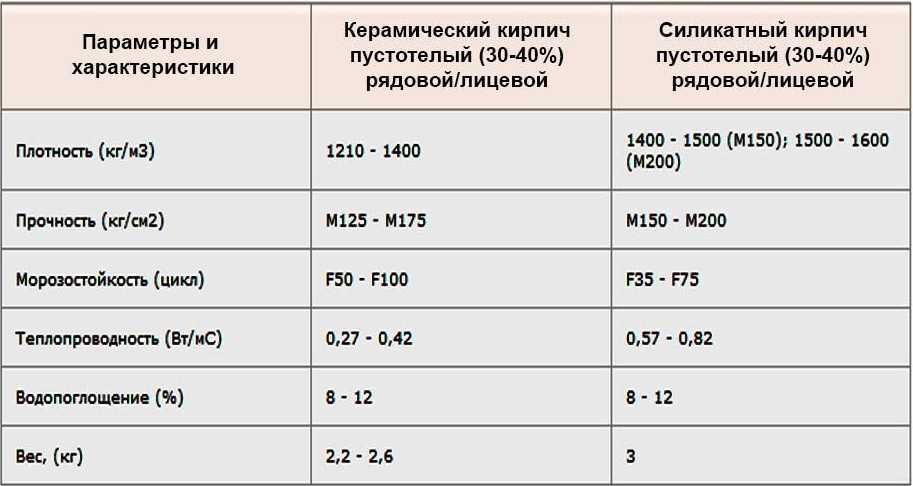 Сравнение характеристик керамического кирпича — пустотного разной плотности, полнотелого