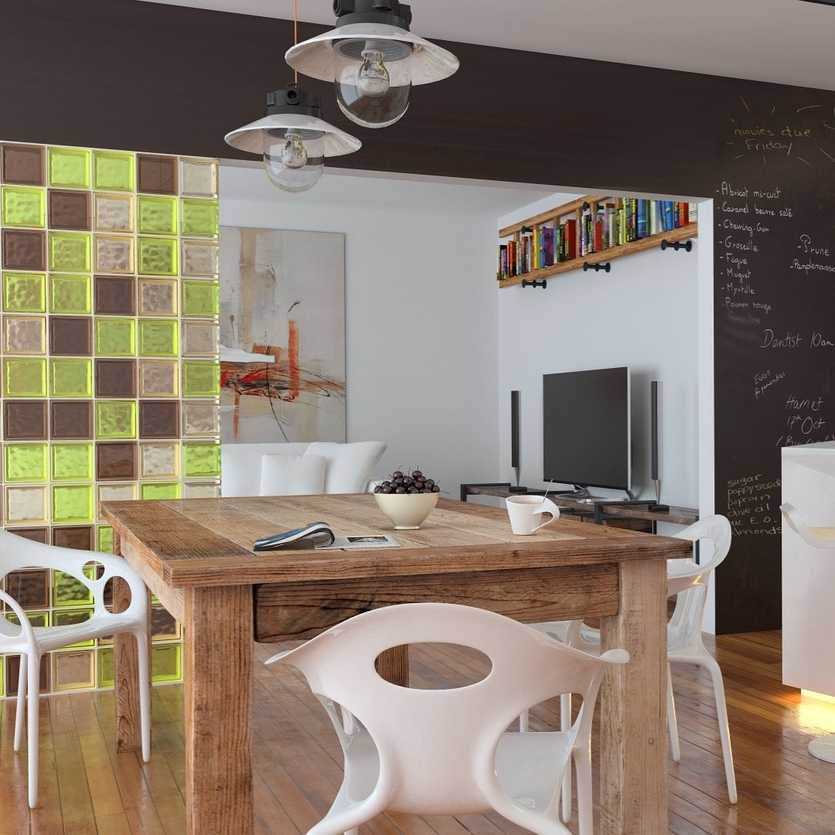 С помощью практичного современного материала можно создать отличный декор, который станет настоящим произведением искусства. Стеклянные квадраты устанавливают вдоль одной из стен гостиной, по периметру окон, рядом с межкомнатной перегородкой. Выложенные по запланированной схеме разноцветные блоки станут изюминкой интерьера.
