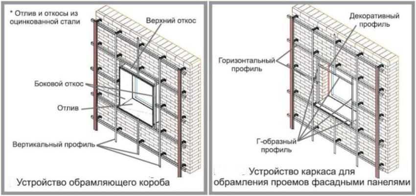 Металлический каркас вокруг оконных и дверных проемов должен представлять собой прочную раму правильной геометрической формы, в точности повторяющую контуры проема. Необходимо учесть, что откосы и отлив должны иметь небольшой уклон от установленного в доме окна. Поэтому каркас монтируют таким образом, чтобы его вертикальные и горизонтальные планки располагались с отступом в 1-2 см от линий окна. Те же требования установлены для дверных проемов.