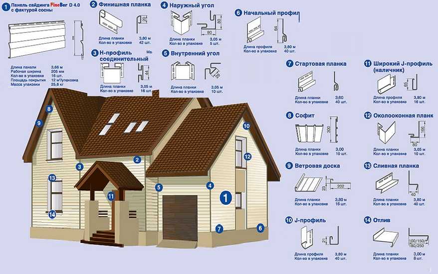 Для того чтобы облицовка деревянного дома виниловым или металлическим сайдингом была выполнена максимально качественно, одновременно с панелями приобретают доборные элементы, которые требуются для отделки оконных и дверных проемов, фронтонов, откосов, Это такие элементы, как:
