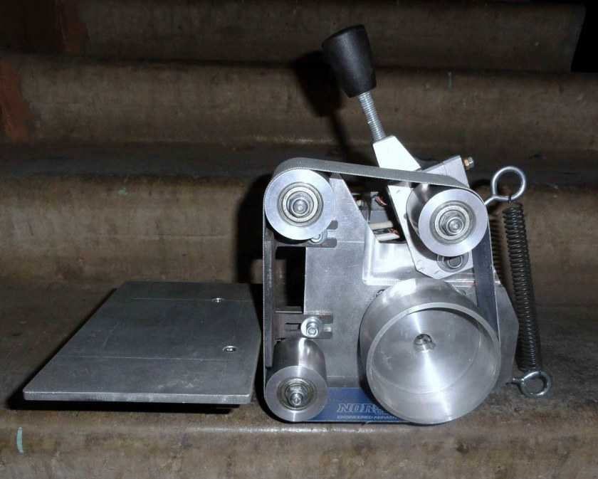 Чтобы изготовить устройство, достаточно сделать металлическую основу под ролики, натянуть ленту, и подогнать размеры ведущего ролика, под направляющую ШМУ, и станок готов.