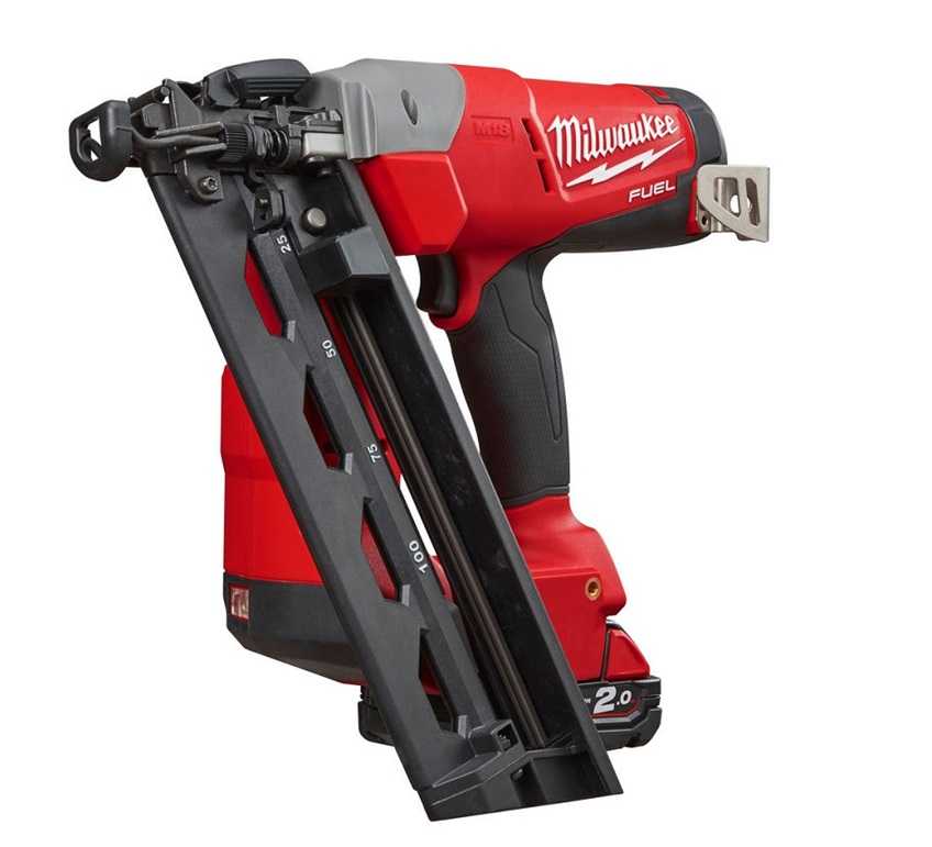 - Если вы ищете автономный инструмент, вполне возможно, что вам больше всего подойдет газовый нейлер. Мощности его хватает даже для забивания дюбелей в бетон. Работает он от микровзрывов газовоздушной смеси, которая воспламеняется от искры, возникающей благодаря аккумулятору. Взрыв толкает поршень, который и вбивает гвоздь в поверхность. Инструмент работает от сменного газового баллончика и аккумулятора, и того, и другого, в среднем, хватает на 1000 выстрелов! Отсутствие шнуров и шлангов – главное преимущество такого нейлера. Вес аппарата немного больше, чем у газового аналога – от 2,5 до 4 кг. В обслуживании он также достаточно прост. Кроме того, некоторые модели можно использовать и в качестве дрели или перфоратора. К недостаткам газового нейлера относят высокую стоимость как аппарата, так и выстрела. Выхлопные газы не позволяют работать в закрытых помещениях, а камеру сгорания нужно постоянно очищать от сажи и нагара.