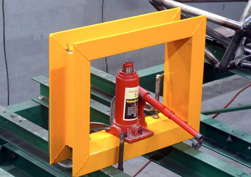 - сделать съемный упор в форме перемещаемого рабочего стола, который можно зафиксировать на станине прутками или гайками и болтами. Для этого в раме делают отверстия с дистанцией по высоте меньше перемещения штока домкрата;